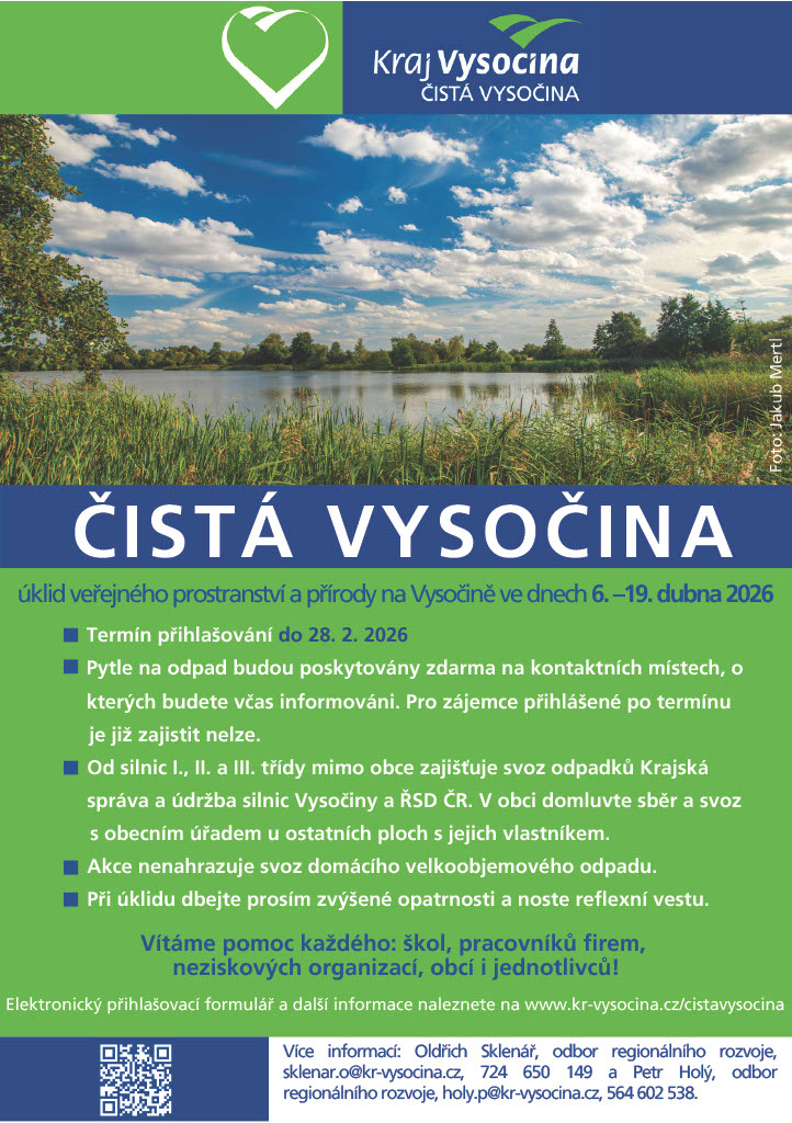 - Přihlášení probíhá od 1. 1. do 28. 2. 2026 prostřednictvím elektronického formuláře na webových stránkách Kraje Vysočina: www.kr-vysocina.cz/cistavysocina. Na tomto odkazu také najdete aktuální mapu už přihlášených úseků.